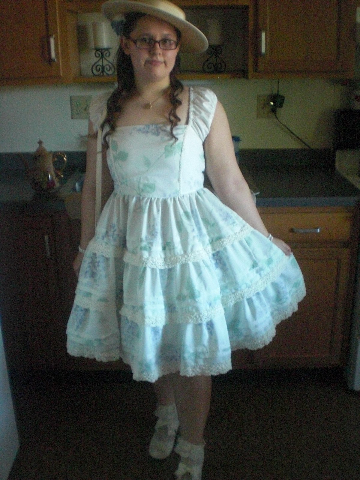 From the shoulder point, find how far away you need to plot the next point. (5.7-1.4)/88*your bust measurement + Z = X (5.7cm for me). Then plot a point 2cm down from that. Now draw a diagonal line from the neckline point to the point you just plotted. From this diagonal line, draw a straight line 8.2cm down. Before we draw the curve, we're going to work on the next pattern piece. Start at the waist line and plug 2.5 into your equation. Disregard the subtraction and adding Z here. 2.5/70*your waist measurement (83)=X (2.9). Plot a point and connect to the bust line. I did a bit of math here and found that the pattern piece bottom portion is 13cm. So, using our equation once again... (13-1.2)/70*your waist measurement + Z = X (14.7 for me). So draw a line X cm away from the last point you plotted. Now move back up to the bust line. Continue this line, using the number 15.6. (15.6-1.4)/88*your bust measurement +Z = X (I got 17.2). Connect that line to the waist line. Starting from the bust line, measure up the diagonal line 9.2cm and make a mark. Disregarding the subtraction, plot a point from that using the equation with 5.4. 5.4/88*bust measurement (83)=X ( 6.2). The back pieces are done! Now all you need to do is make your back facing pieces, which is easy enough, remember? Measure 10.5cm down the center back from the neckhole, then 4cm down along the line connecting the bust and waist. Draw a curvy line connecting the points and you're done! You should be constantly referring to your book to find the measurements. It can be a little tricky to figure out at first, but the images have everything you need. Double check the pattern measurements by measuring along each piece's waist and bust line and adding the measurements together. You should get a number an inch or two larger than your measurements The next thing to do is to 'draft' the skirt portion. This doesn't require an actual pattern piece because the skirt is basically a long rectangle. The usual skirt width in lolita is 3x your waist measurement, though you can increase or decrease this as you feel necessary. You now have all the tools you need to resize Otome no Sewing patterns for your body!! You can apply this system to pretty much any pattern in the book. Make sure to make a muslin (or practice version) before using your actual dress pattern so you can address any sizing problems there may be. Here is my final product! I changed the skirt because I prefer pleats, but I actually drafted a whole new pattern following this tutorial to insure accuracy. All in all, it turned out pretty well. I didn't bother making a muslin this time around so there are a few small fitting issues I'd correct if I made it again, but I'm happy with it. Anyway, I hope you found this tutorial useful! Happy sewing! |